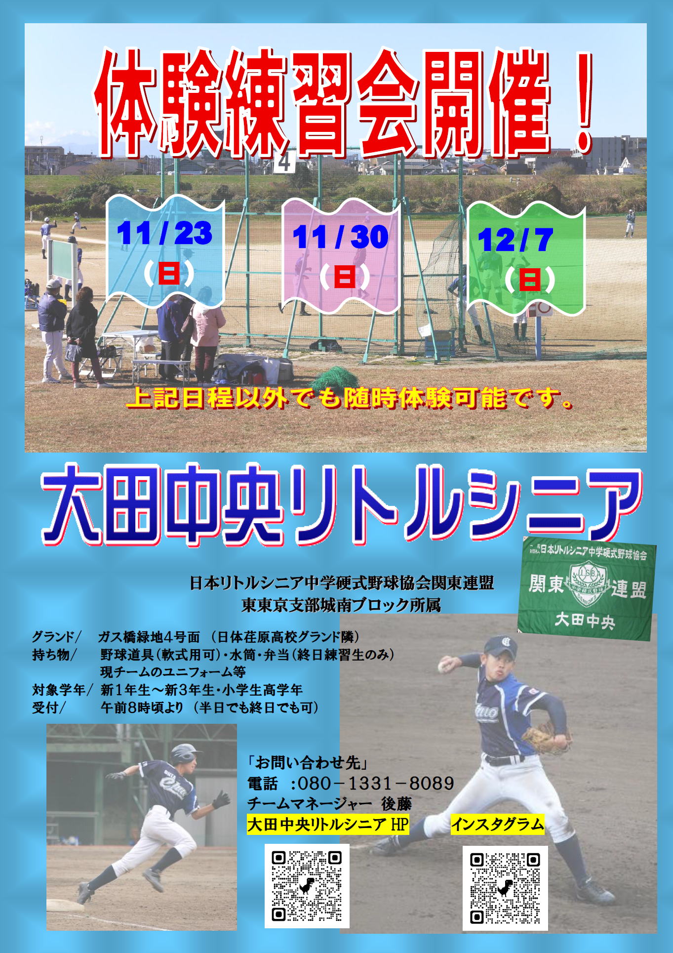 当チームでは随時選手の募集をしております。まだ所属チームを迷っておられる方、所属チームの移動をお考えの方、リトルリーグ退団後にその先の所属先をお考えの方等、練習体験をご希望の方は、チームマネージャー後藤宛にお電話を頂くか、当ホームページの「お問い合わせ」よりご連絡をお願いします。